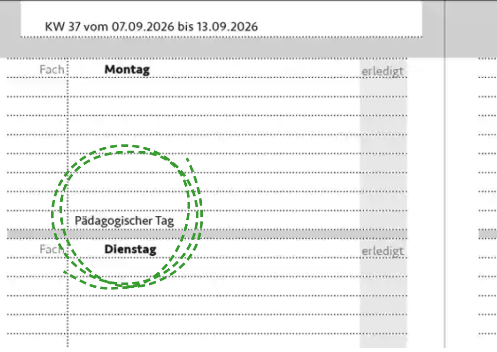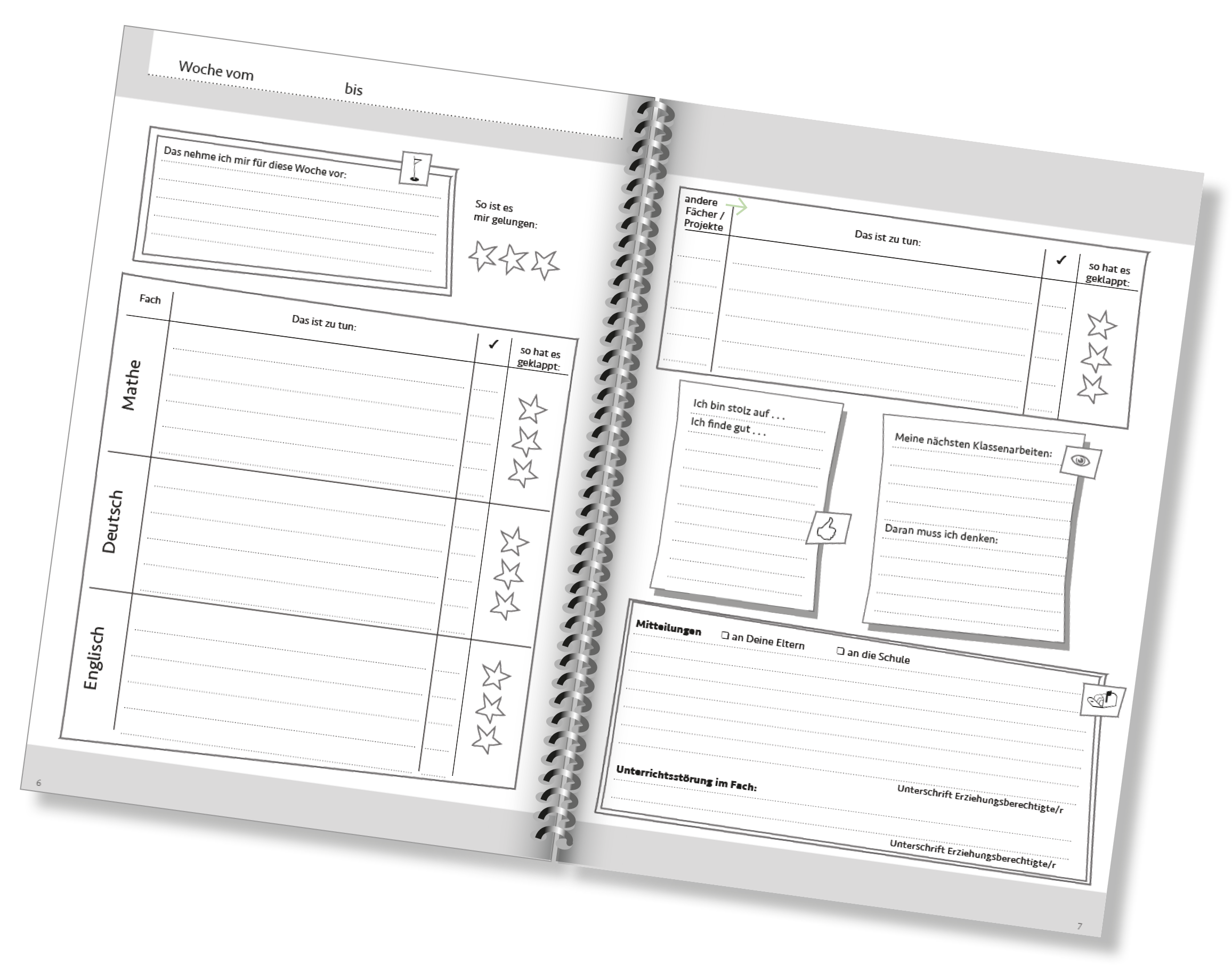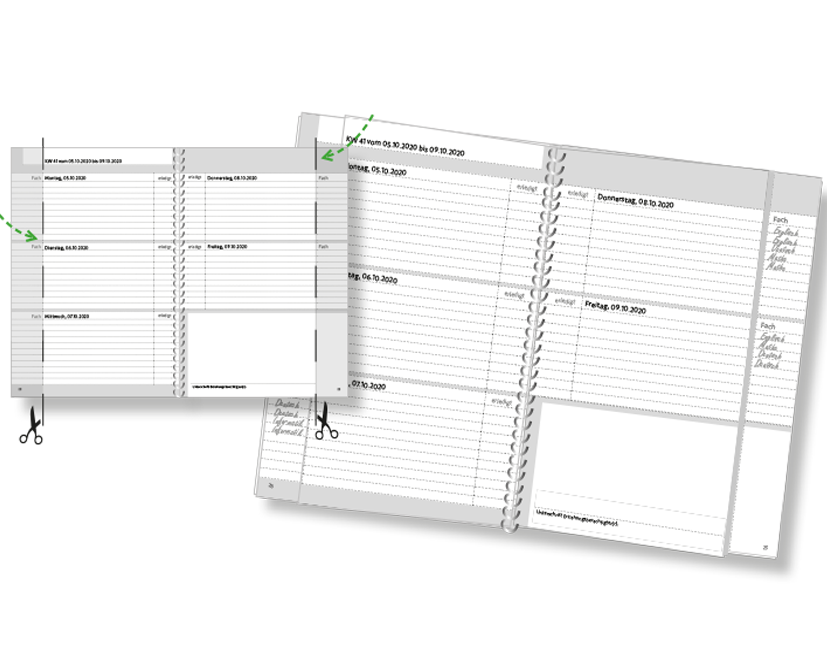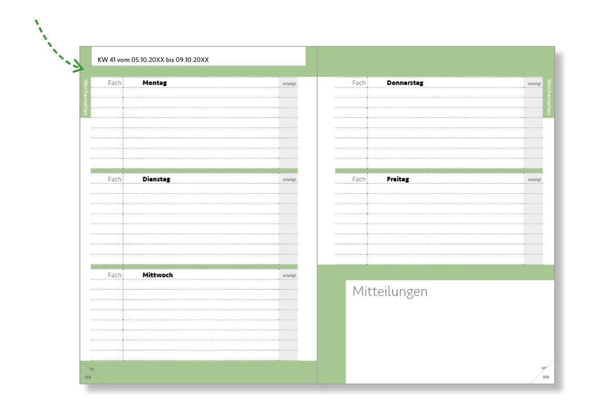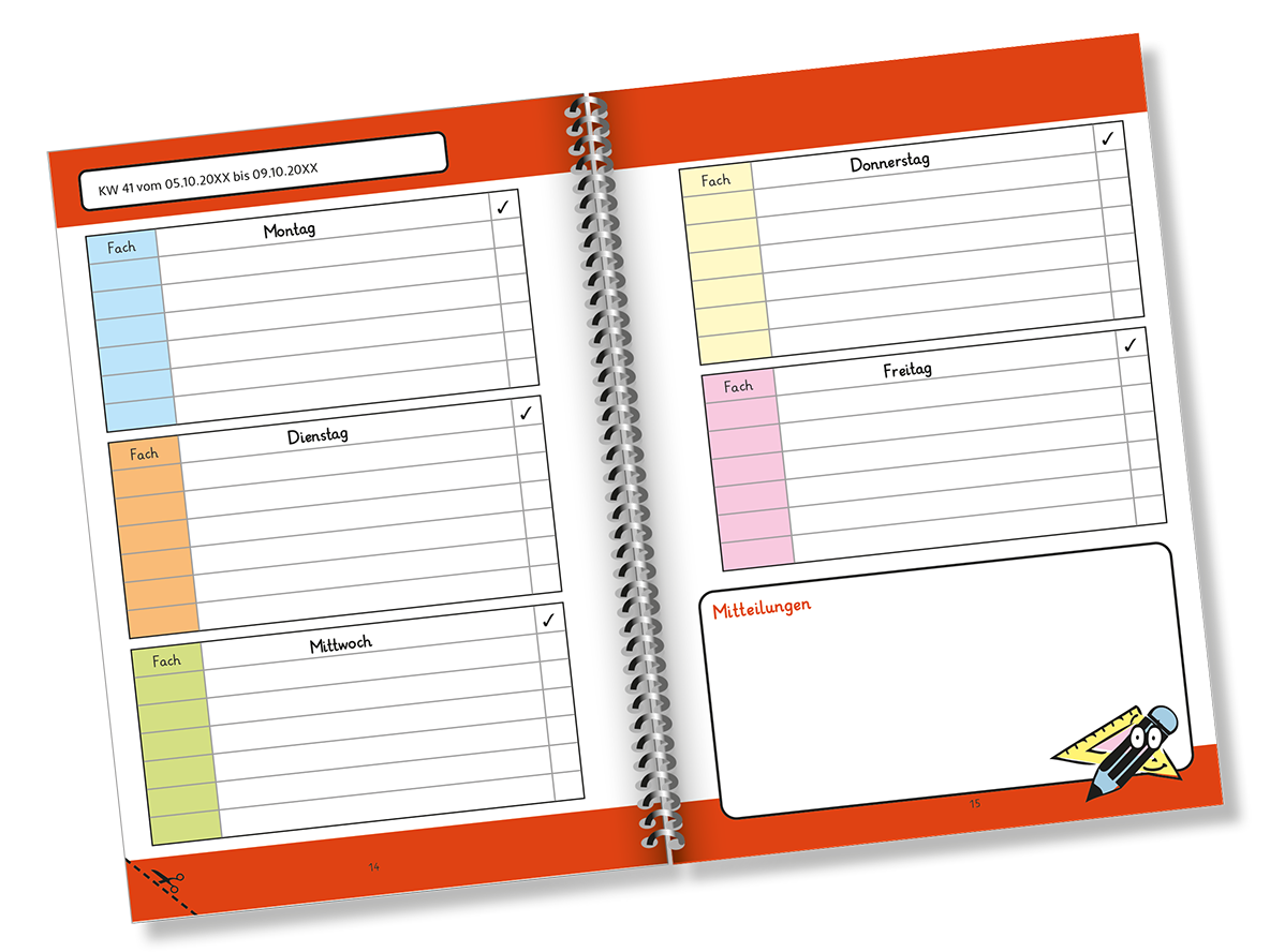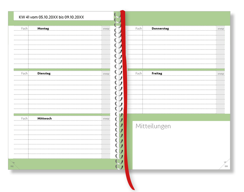 Schuleigene Termine tragen wir gerne in die Planer ein – ganz ohne zusätzliche Kosten. Praktischerweise sind die Wochenübersichtsseiten bereits an Ihr Bundesland angepasst.hmen.